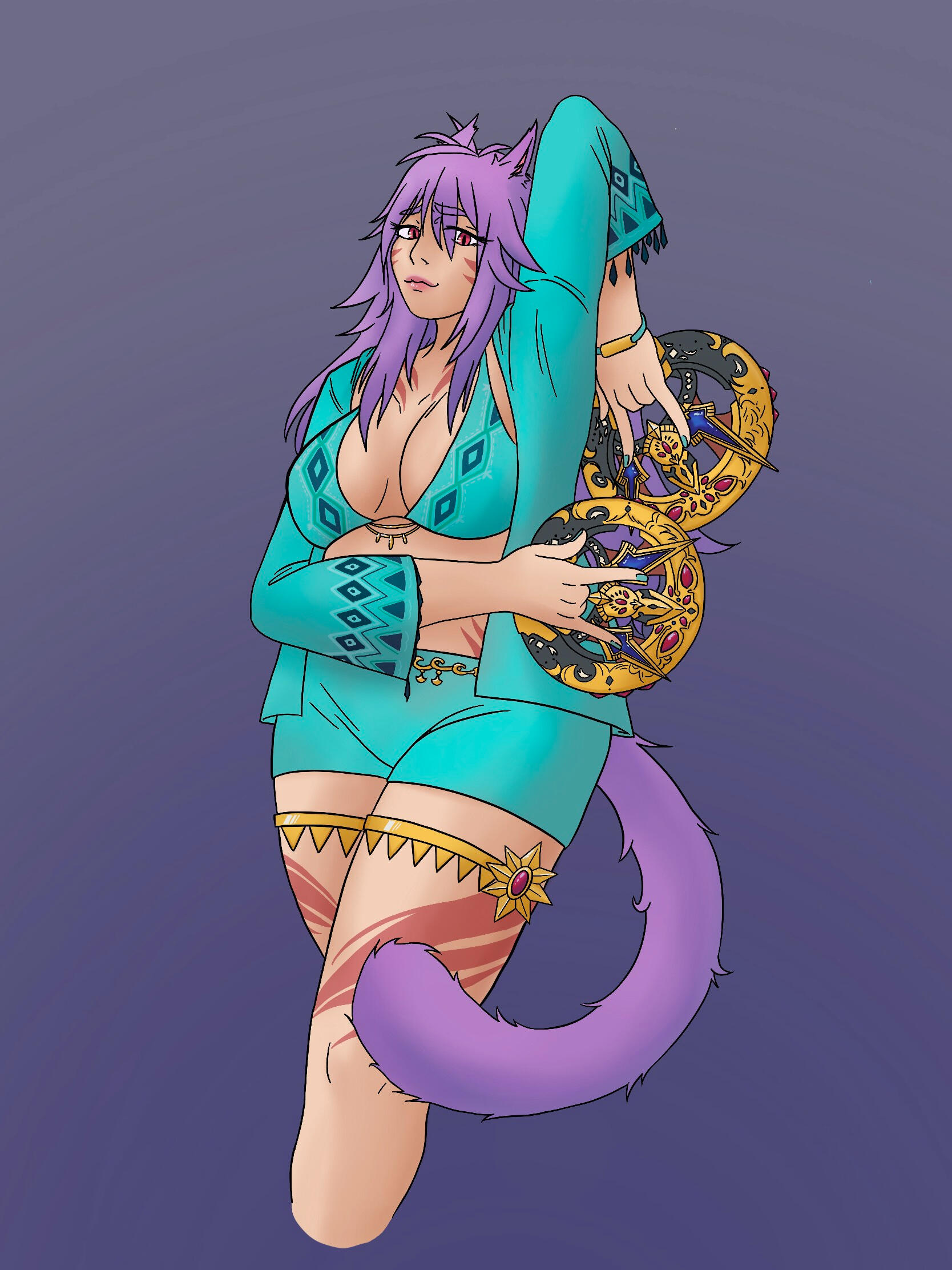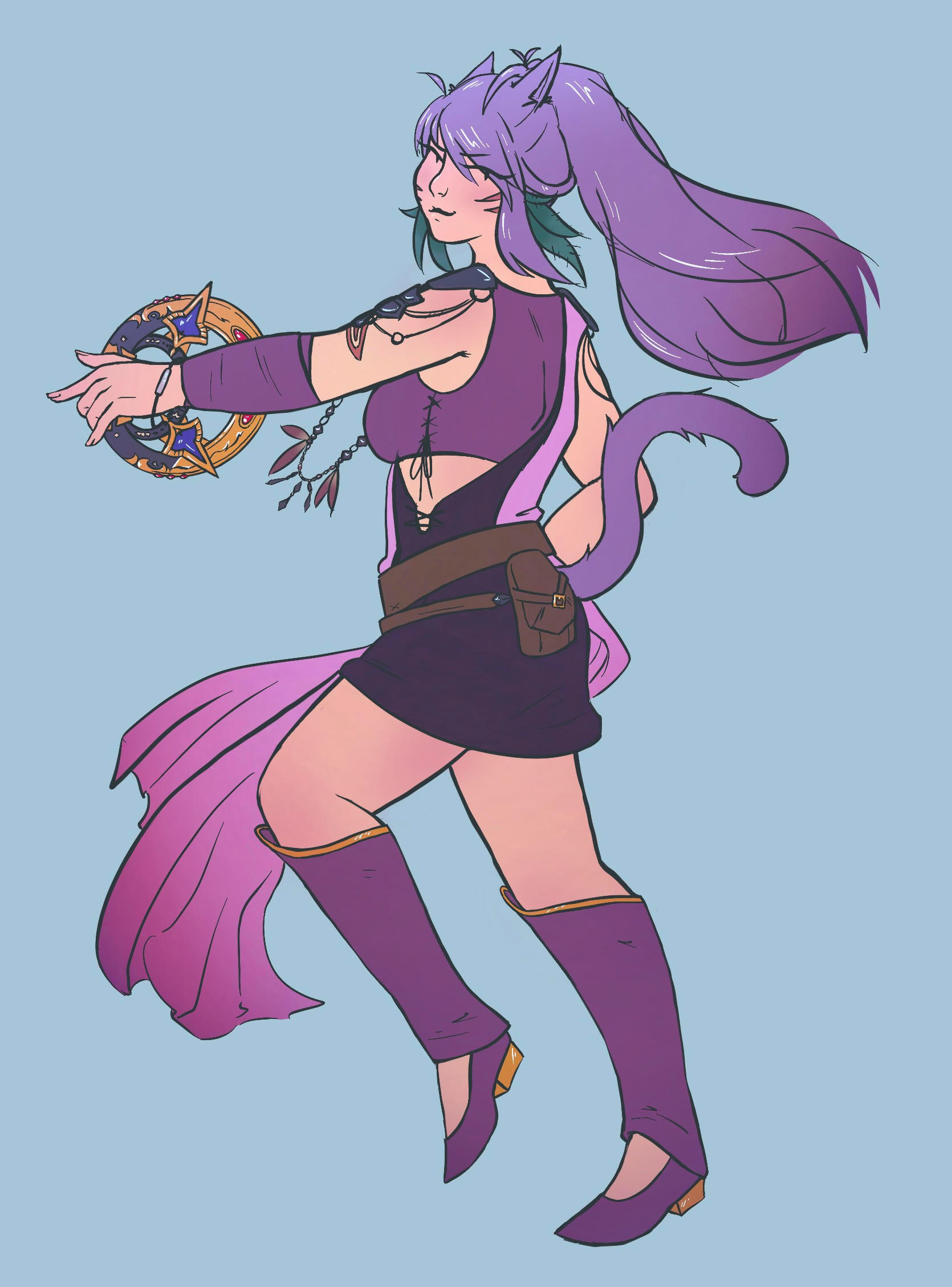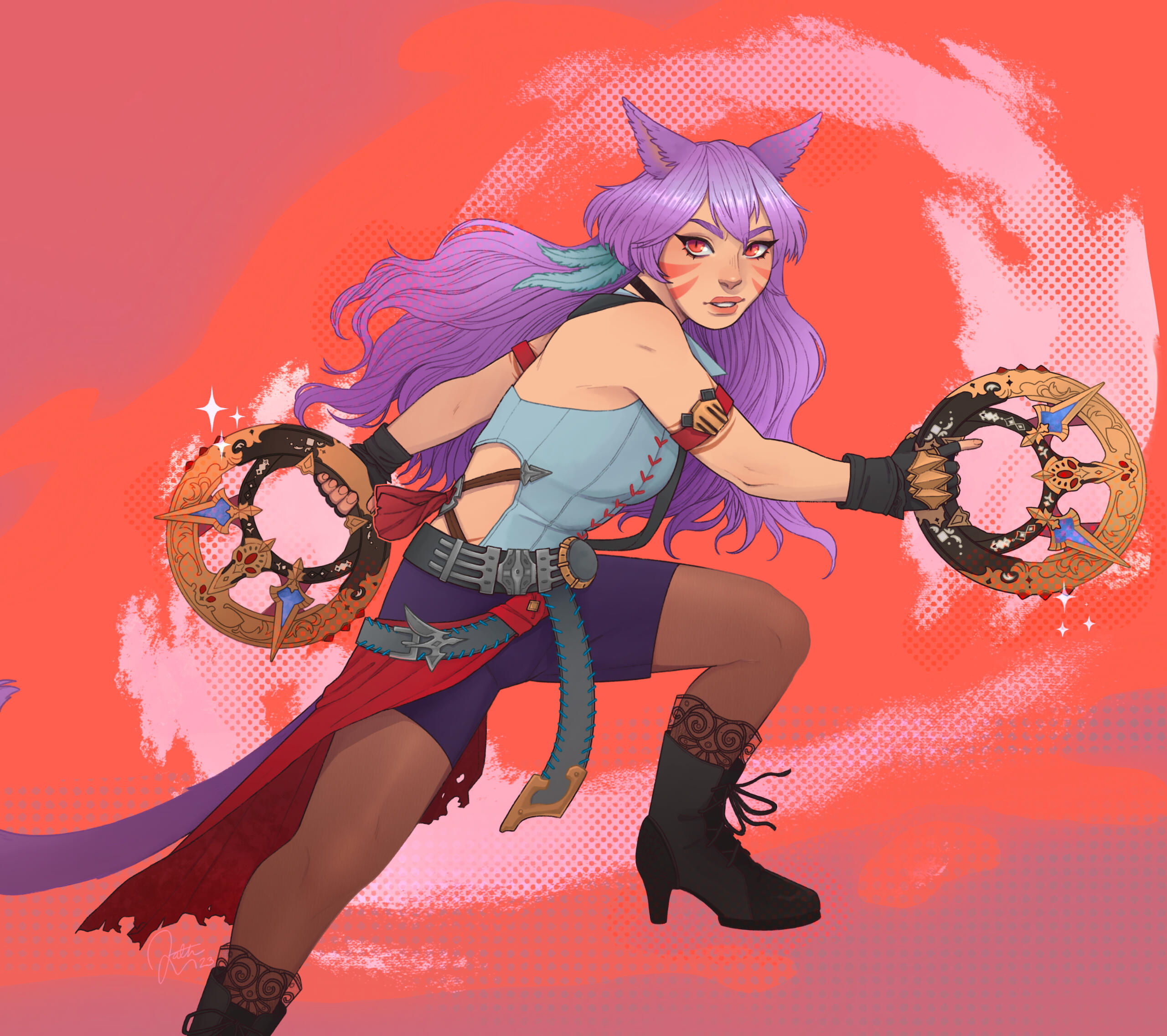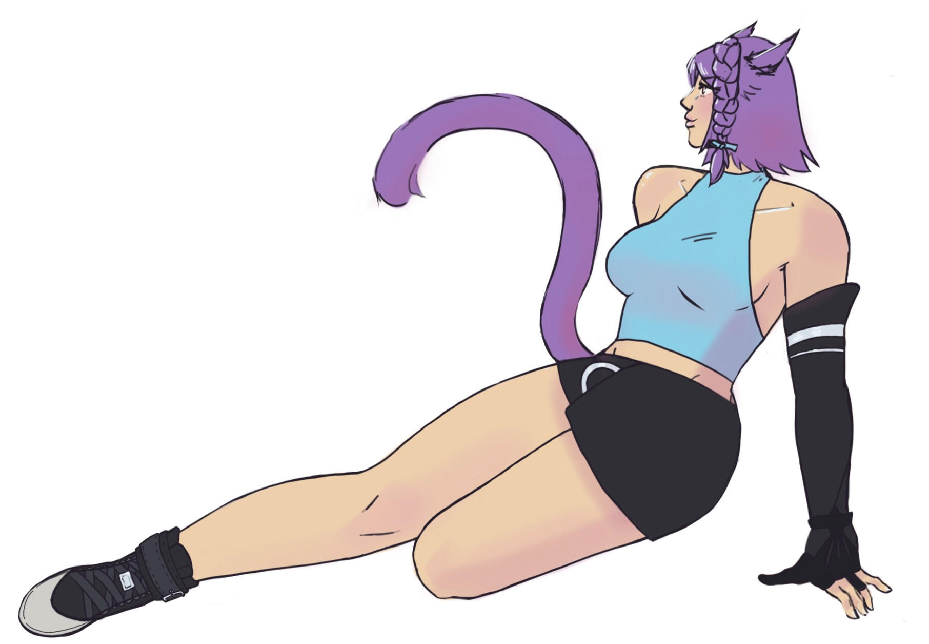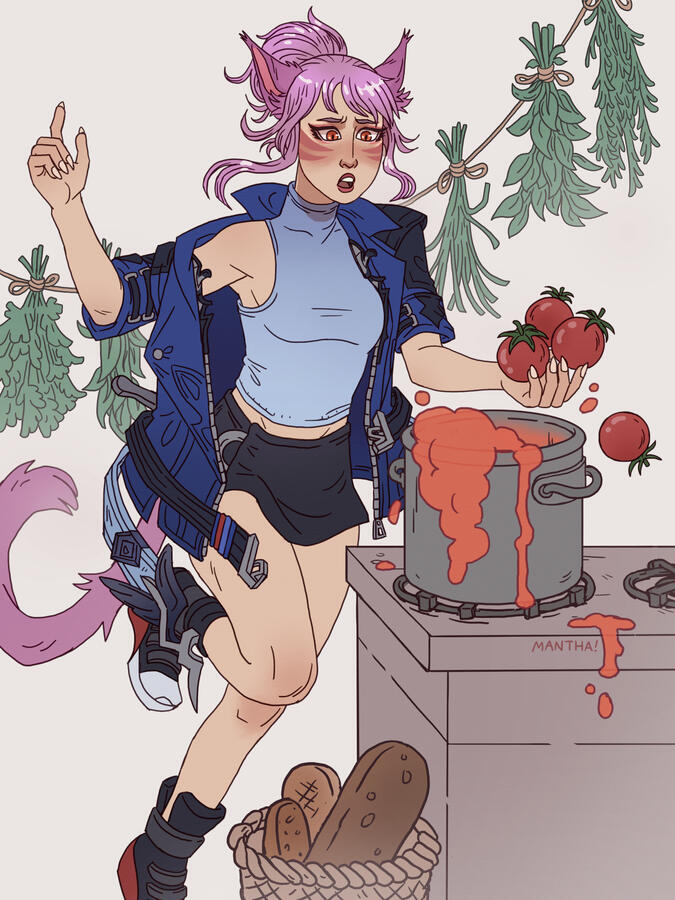 H'sypha is short, even for a miqo'te, standing at 4 fulms, 10 ilms - a square 5 fulms including her ears. She's chubby, her body fuller than most miqo'te, with powerful muscle typical of her race. Her hair is long and wild, cascading down below her rear. It's often tied in a high ponytail with intricate braiding woven in. Her hair and fur are a light lilac color, and her eyes are salmon pink, traits she inherited from her father and mother, respectively.Her tail is bushy with long fur. Though often covered, she also sports additional clan tattoos on her collar, upper arms, hips, and thighs. Besides this, she typically looks chipper, though she may appear deep in thought if she's working out the kinks in a new recipe...