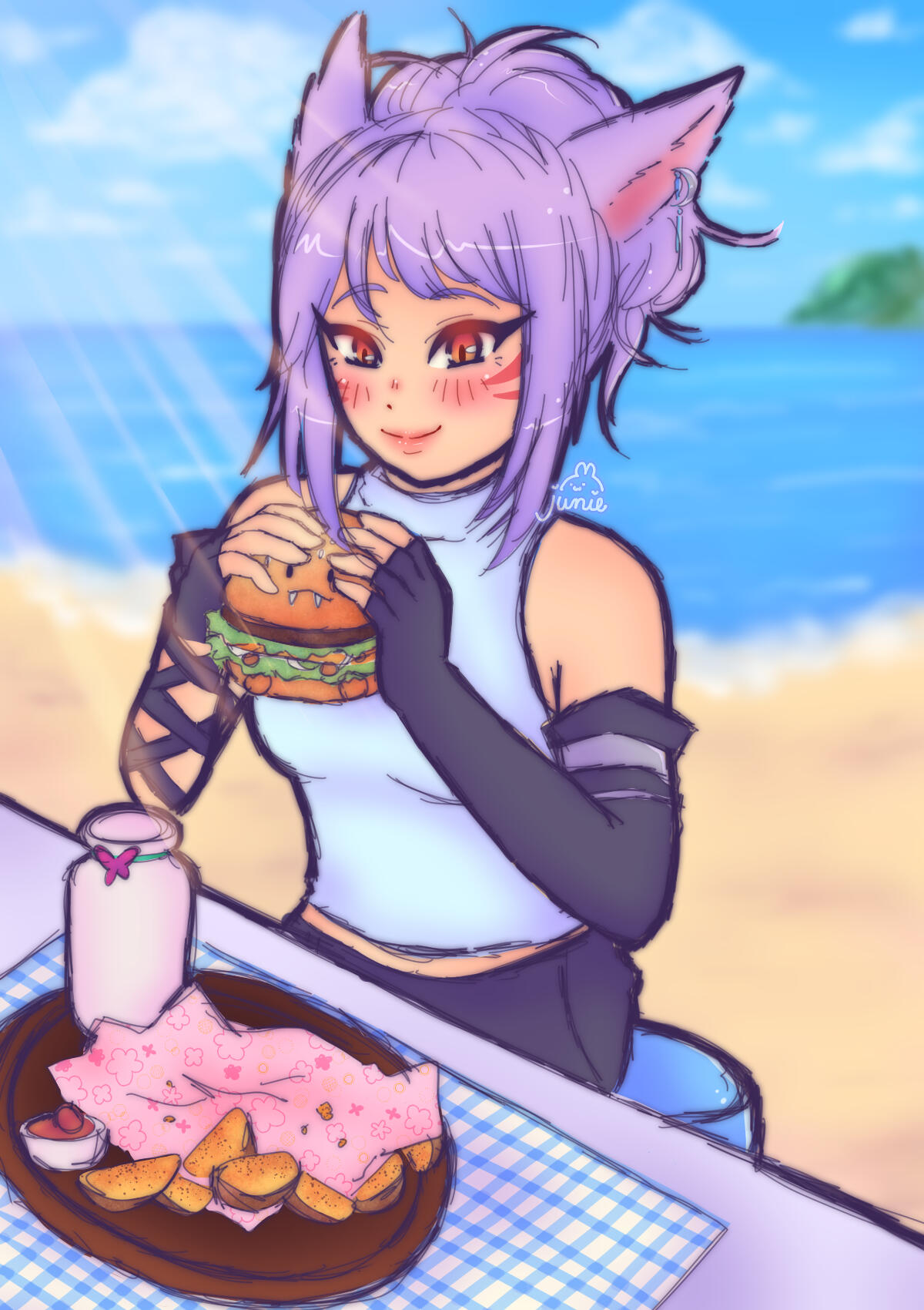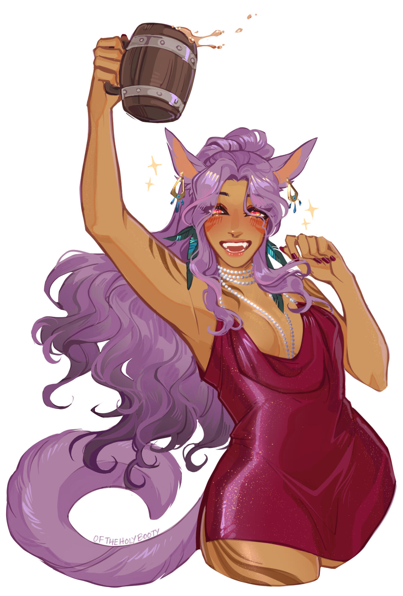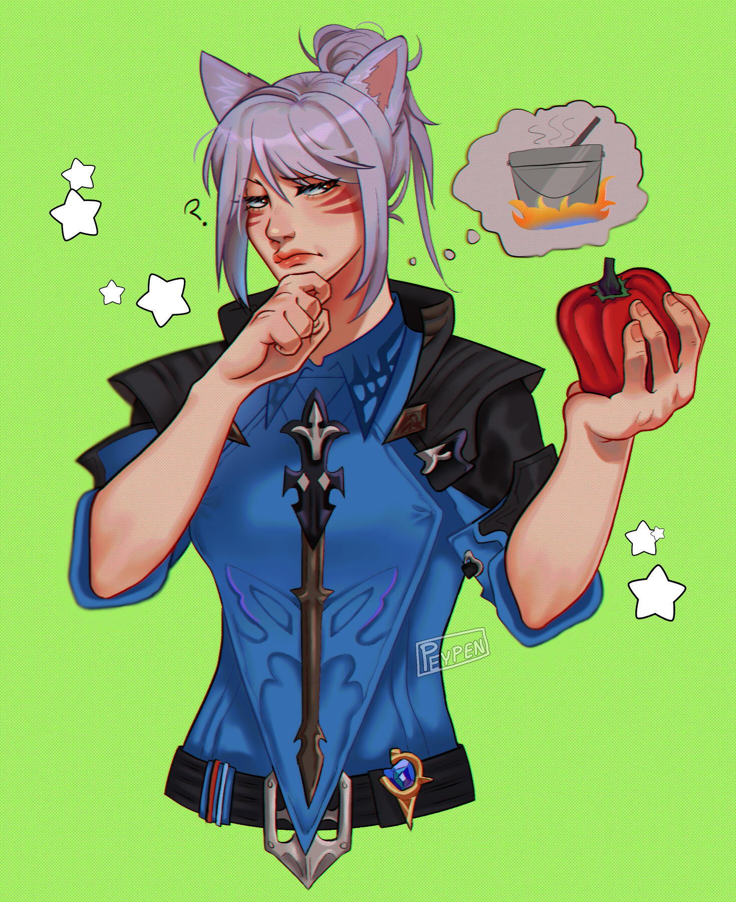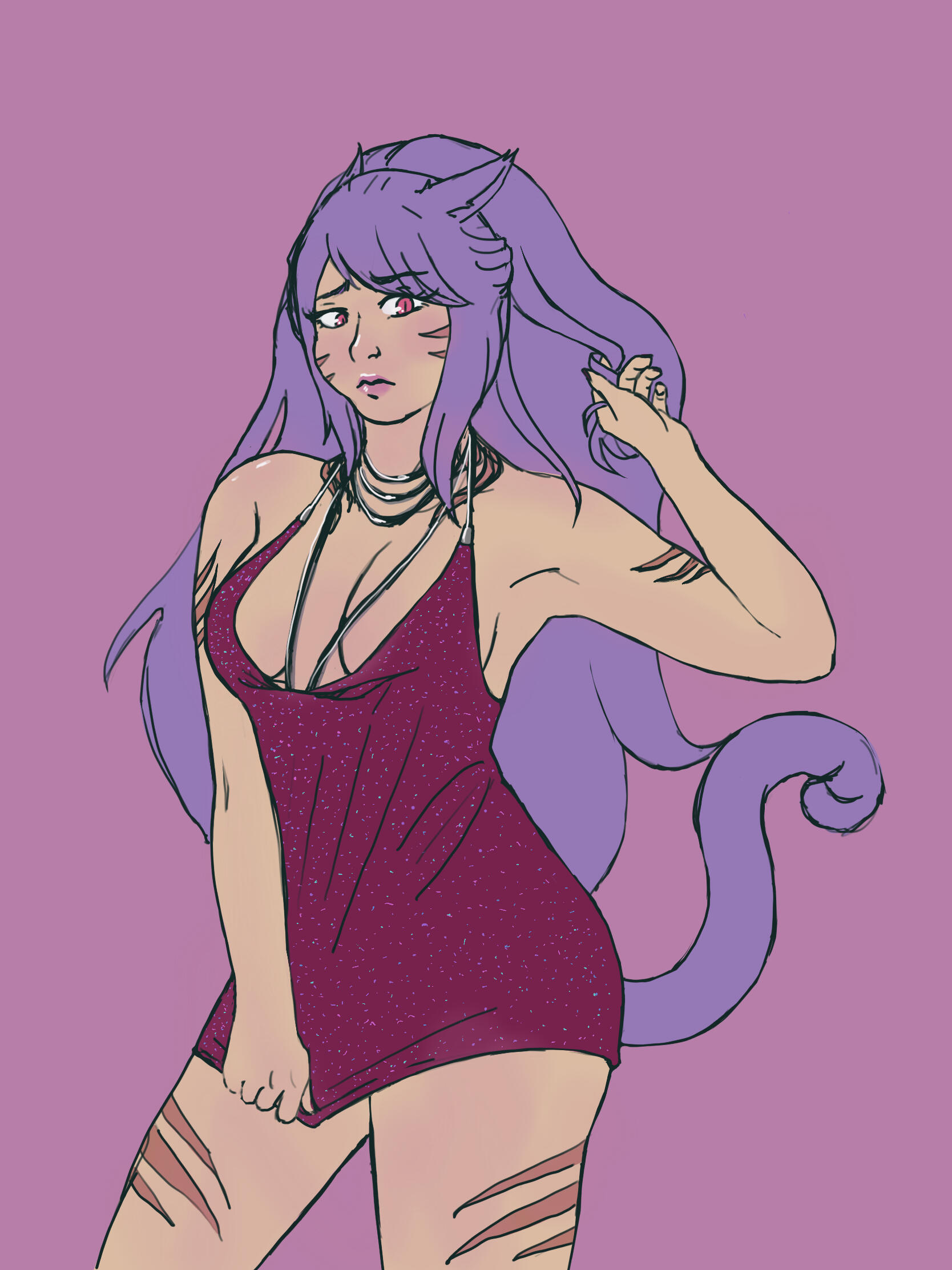 H'sypha is short, even for a miqo'te, standing at 4 fulms, 10 ilms - a square 5 fulms including her ears. She's chubby, her body fuller than most miqo'te, with powerful muscle typical of her race. Her hair is long and wild, cascading down below her rear. It's often tied in a high ponytail with intricate braiding woven in. Her hair and fur are a light lilac color, and her eyes are salmon pink, traits she inherited from her father and mother, respectively.Her tail is bushy with long fur. Though often covered, she also sports additional clan tattoos on her collar, upper arms, hips, and thighs. Besides this, she typically looks chipper, though she may appear deep in thought if she's working out the kinks in a new recipe...
