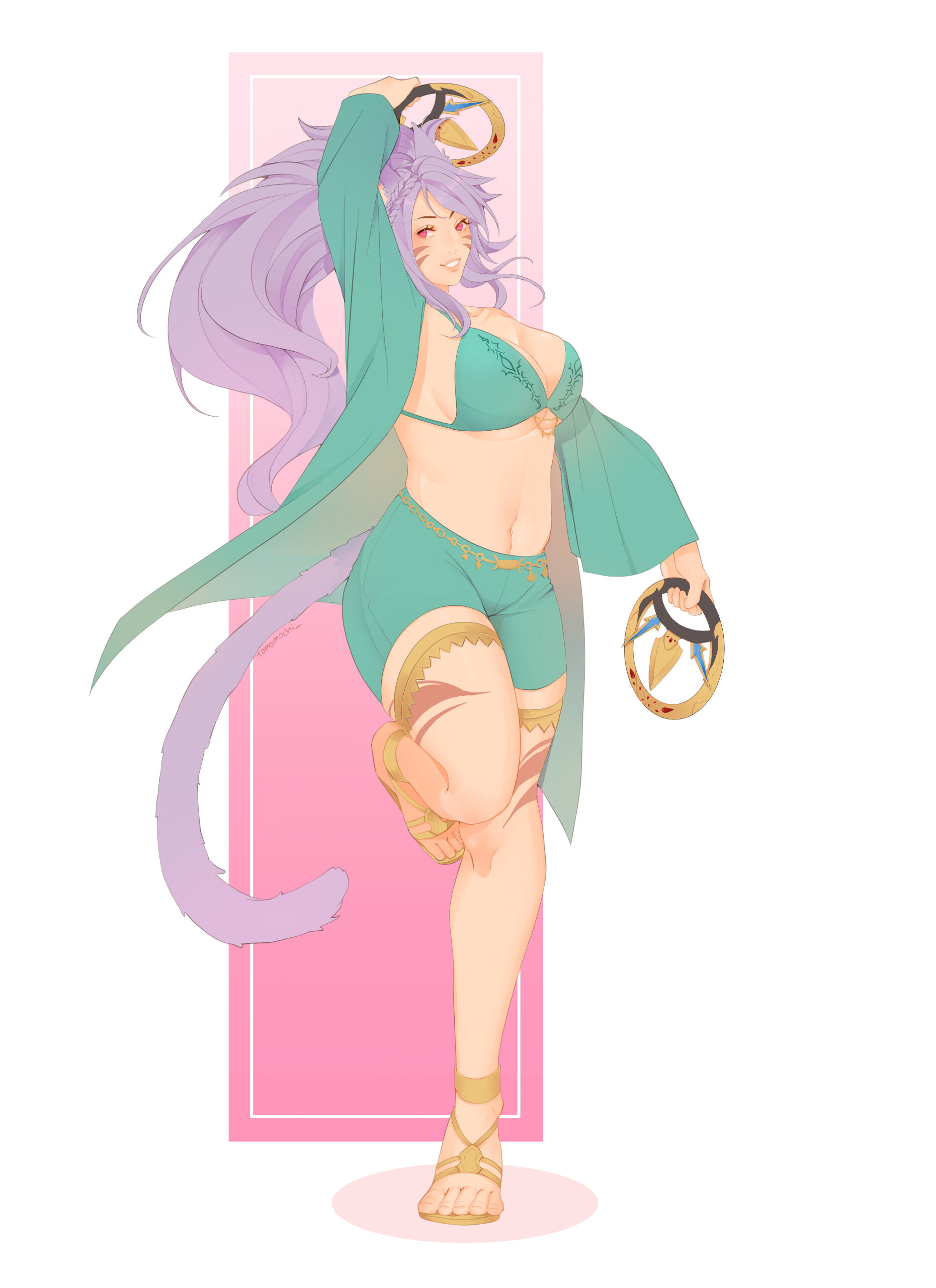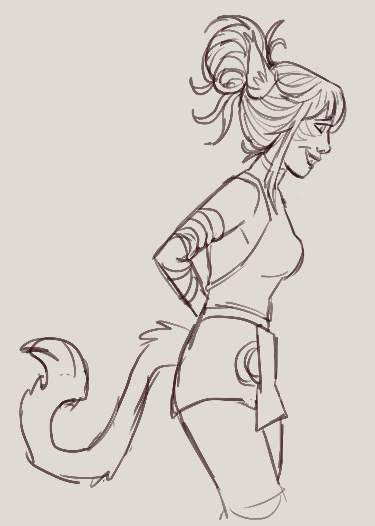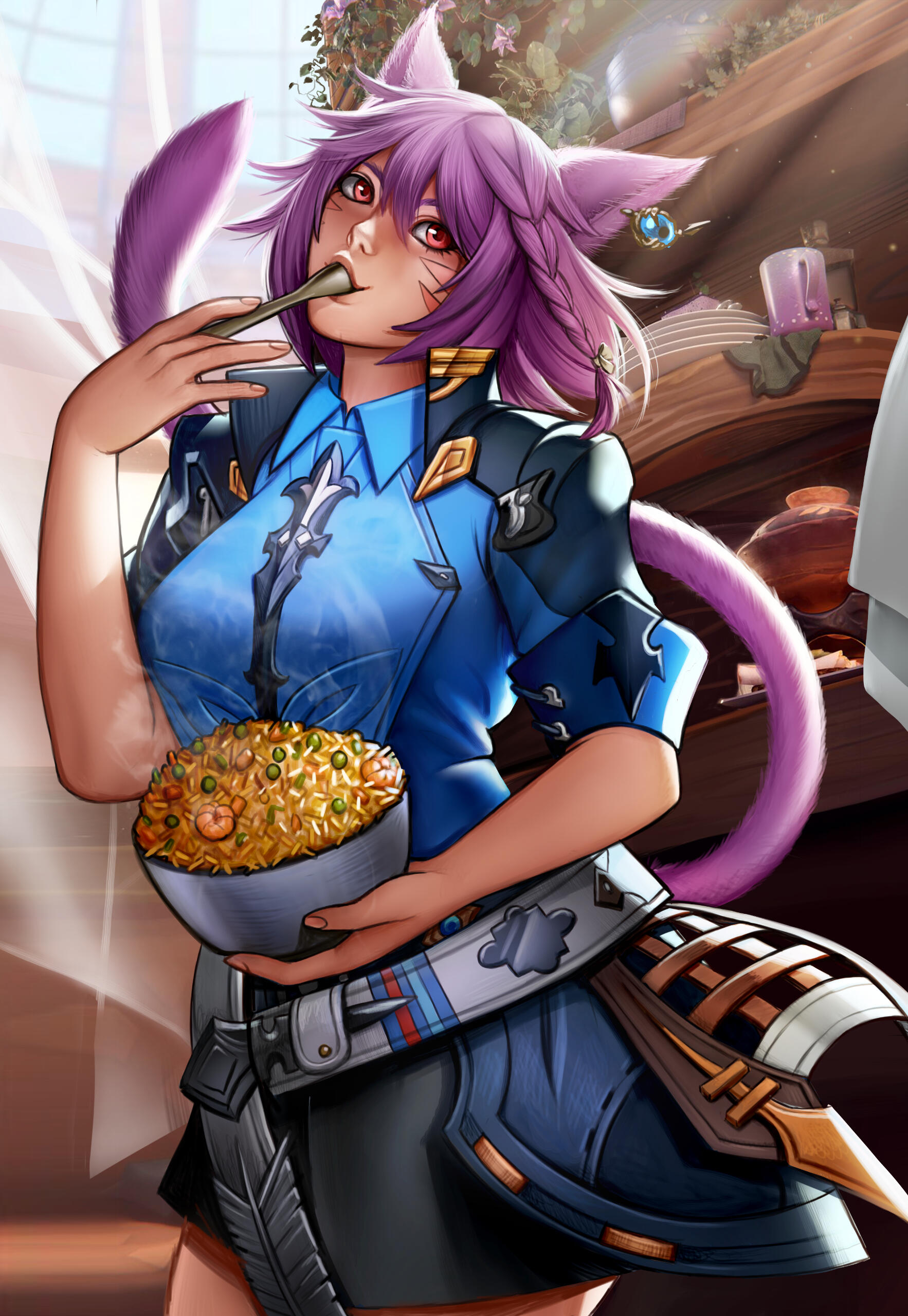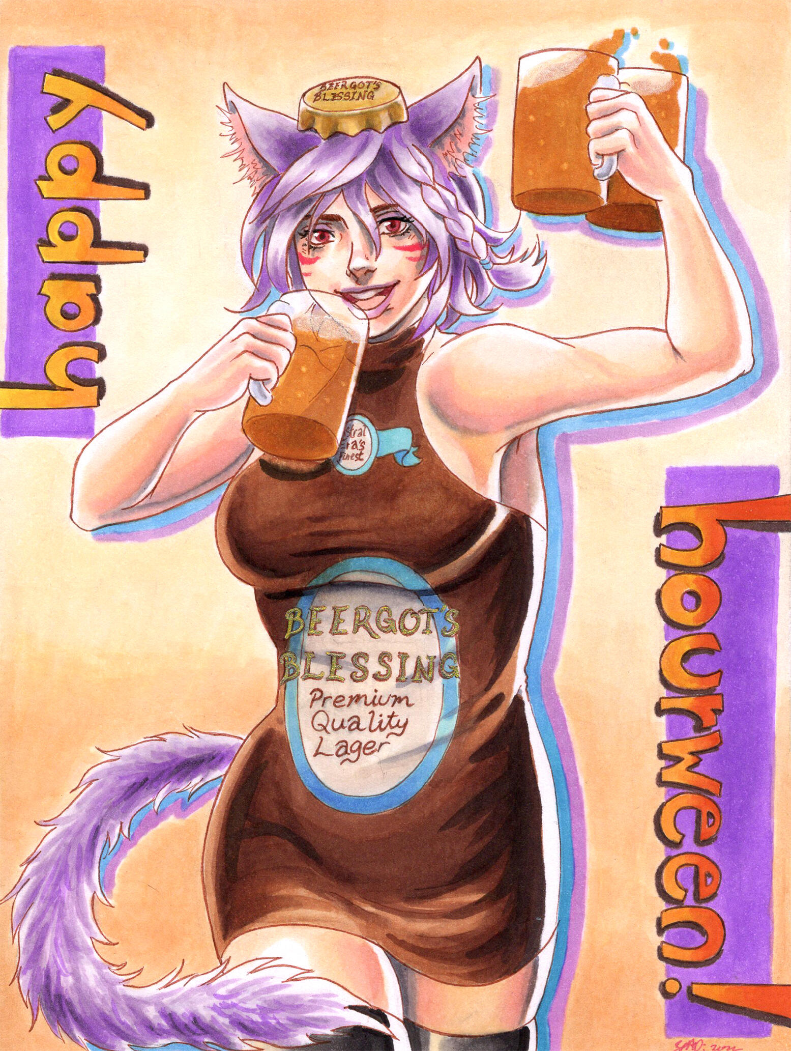 H'sypha is short, even for a miqo'te, standing at 4 fulms, 10 ilms - a square 5 fulms including her ears. She's chubby, her body fuller than most miqo'te, with powerful muscle typical of her race. Her hair is long and wild, cascading down below her rear. It's often tied in a high ponytail with intricate braiding woven in. Her hair and fur are a light lilac color, and her eyes are salmon pink, traits she inherited from her father and mother, respectively.Her tail is bushy with long fur. Though often covered, she also sports additional clan tattoos on her collar, upper arms, hips, and thighs. Besides this, she typically looks chipper, though she may appear deep in thought if she's working out the kinks in a new recipe...