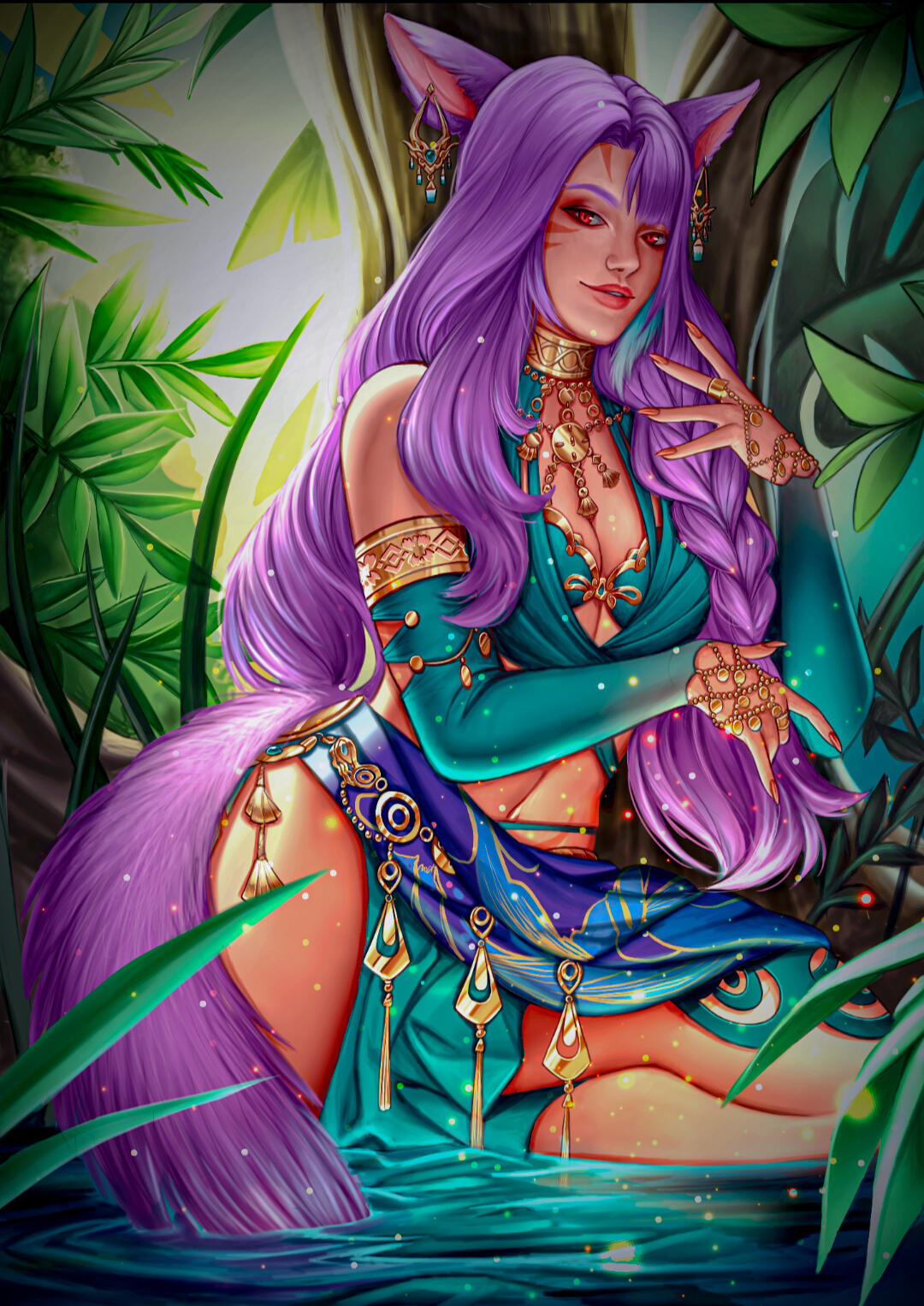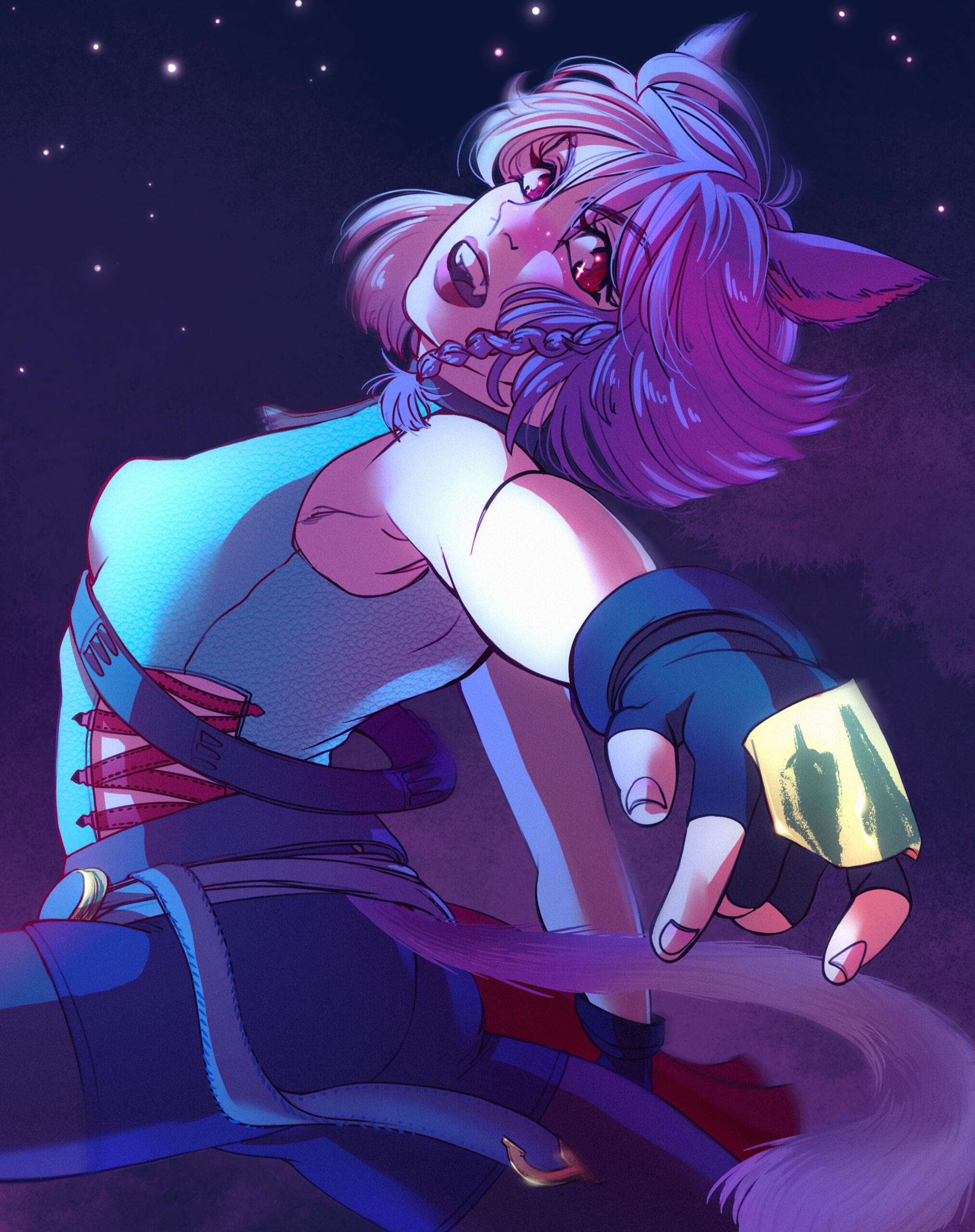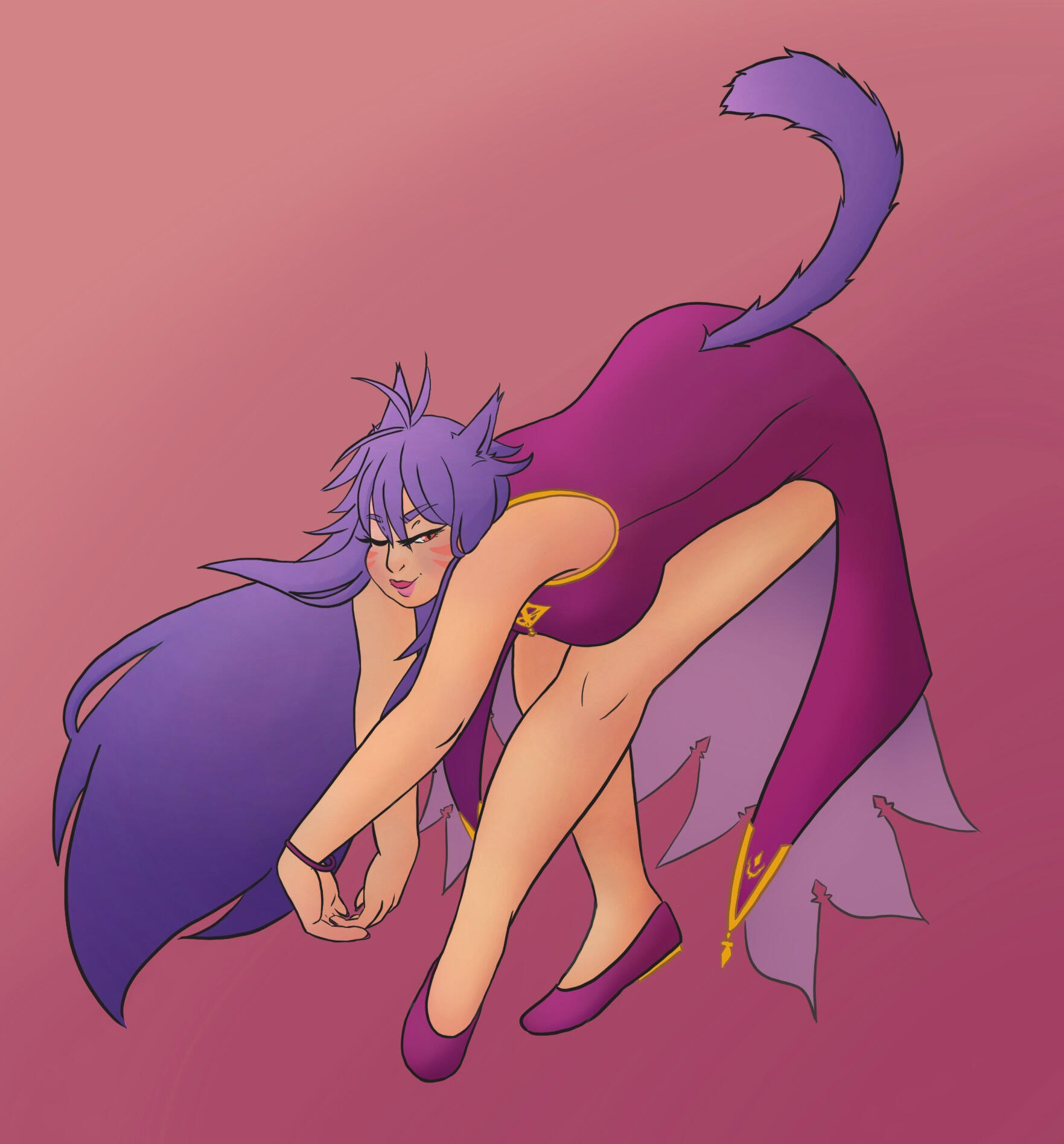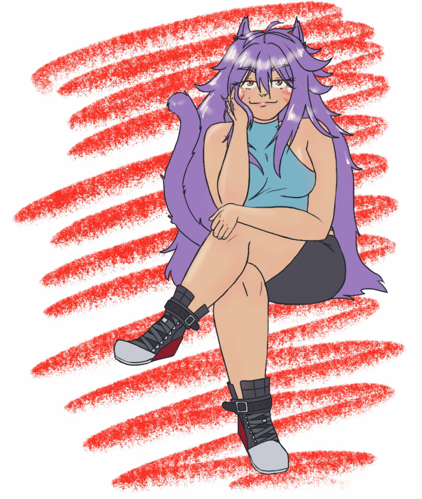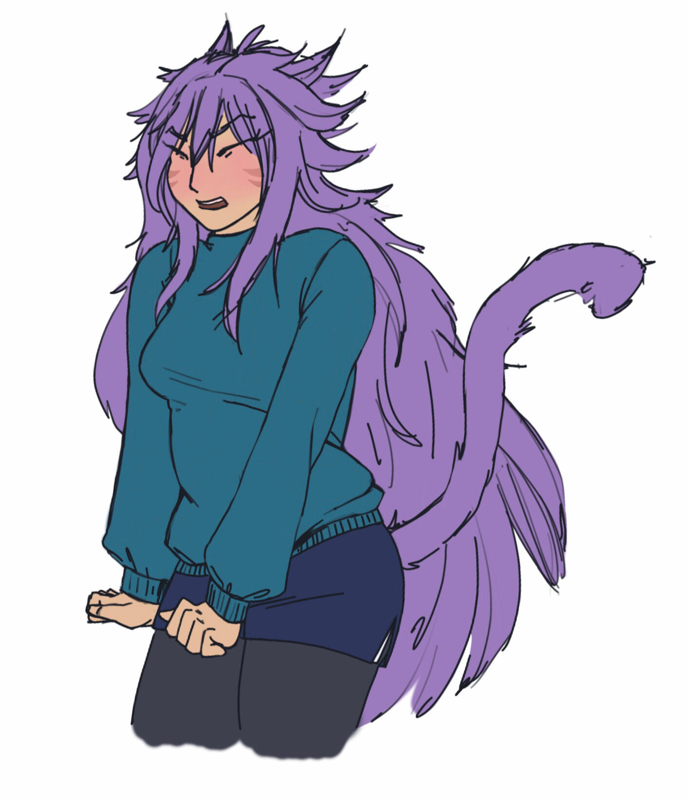 Hair: Wild, lilac waves that cascade down the length of her back. Her tail is fluffy, almost like a bottlebrush.