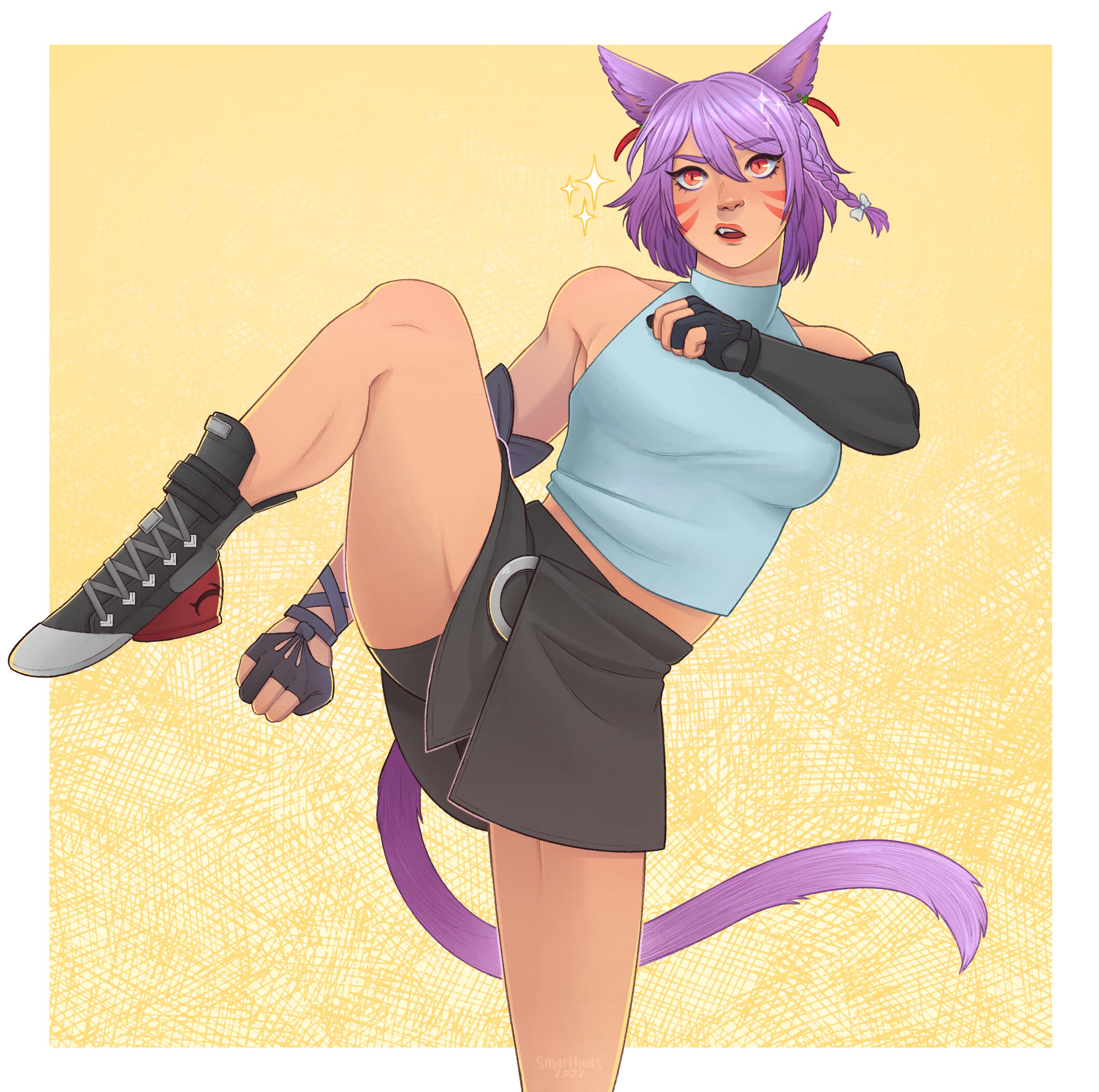 Realizing she'd need more than a knife and pan to gather quality ingredients, she traveled to Ul'dah to join the Pugilist's Guild. This is only the beginning of her journey, and much has happened since. You'll have to learn more about her through roleplay! ;)